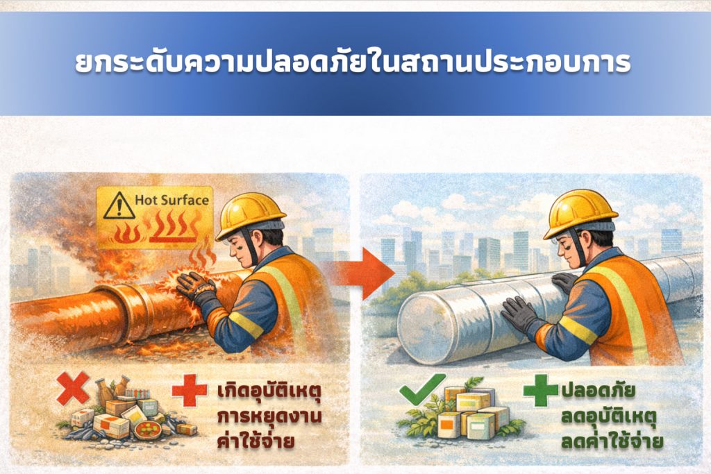 พื้นผิวเครื่องจักรหรือท่อที่มีอุณหภูมิสูงเป็นความเสี่ยงต่อการเกิดอุบัติเหตุในโรงงาน ฉนวนกันความร้อนช่วยลดอุณหภูมิผิวสัมผัส ป้องกันการลวกหรือการบาดเจ็บของพนักงาน ซึ่งส่งผลโดยตรงต่อการลดอุบัติเหตุ การหยุดงาน และค่าใช้จ่ายด้านการชดเชยหรือประกัน